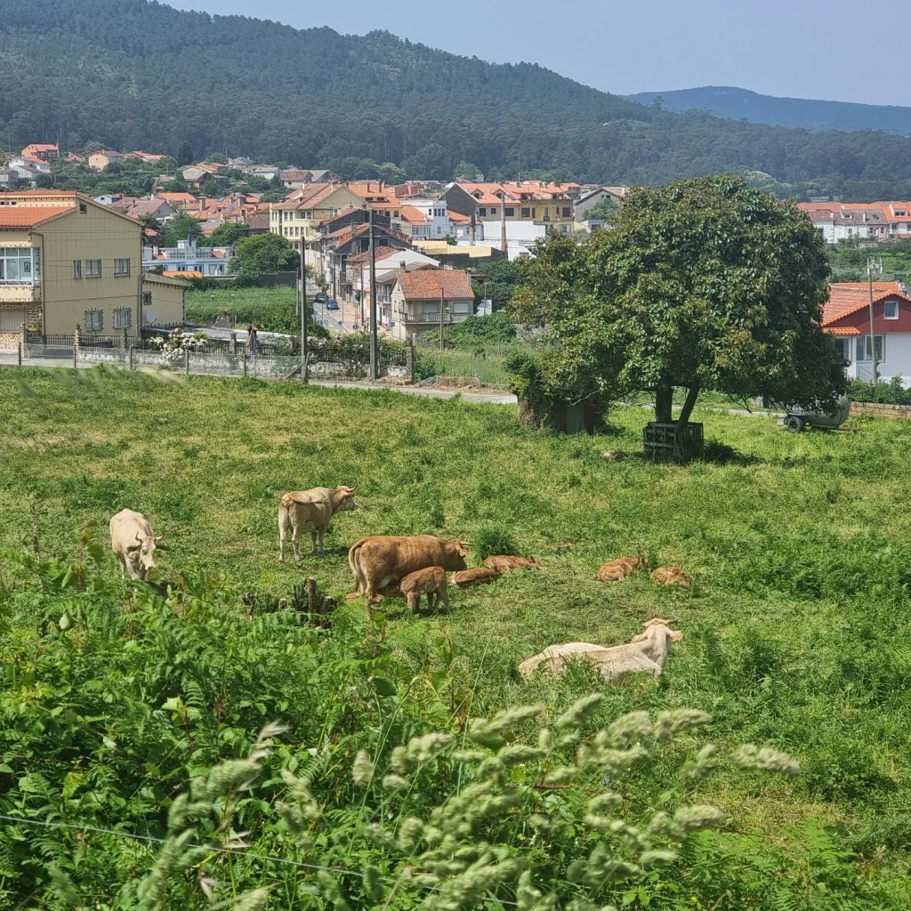 Today should be an easy ish 4 hours along the coast to Begoña’s house, where I have a room for the night. Always a pleasure to meet actual inhabitants. Much cooler, and a bit rainy, as is Galicia’s way, which makes a nice change from the 25 to 30 degree heat most days. Helpfully I have a waterproof hat and lovely rain poncho, new worlds of fashion opening up day by day. Go me.