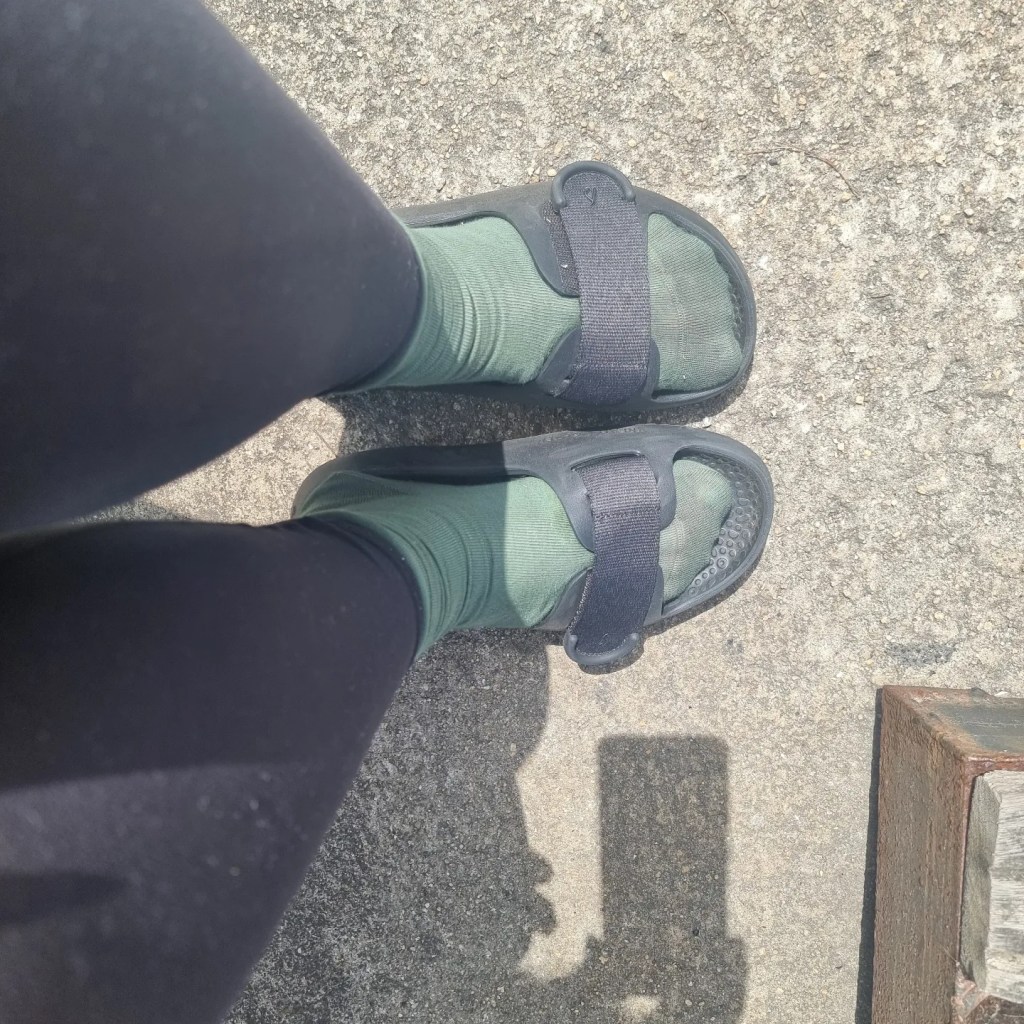 I walked around 10 kms in the heat, on hills and through forest yesterday in the slides, so they are pretty adaptable! Walked with a lovely Korean woman of whom I neglected to get a photo. But we have connected on Instagram, like young people.