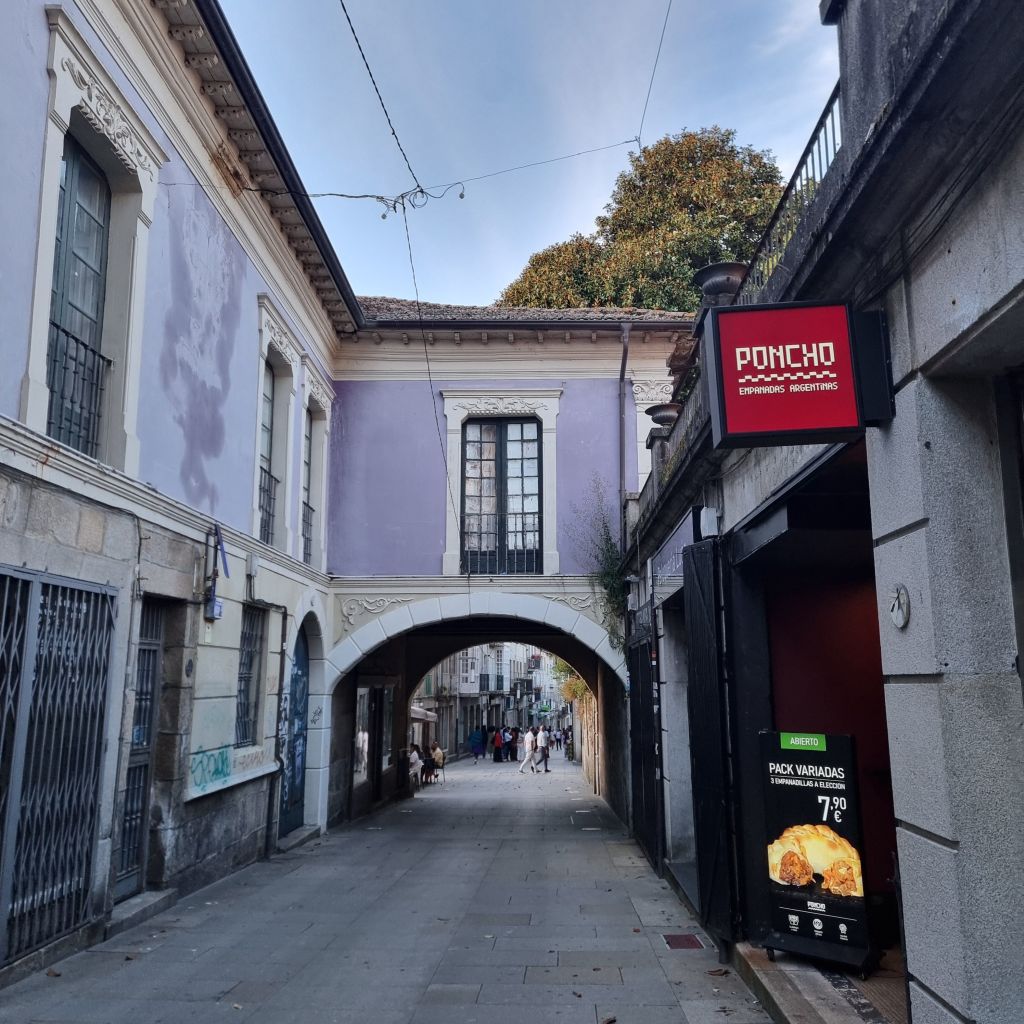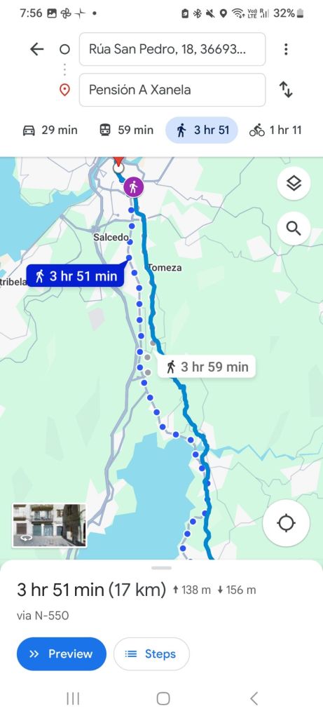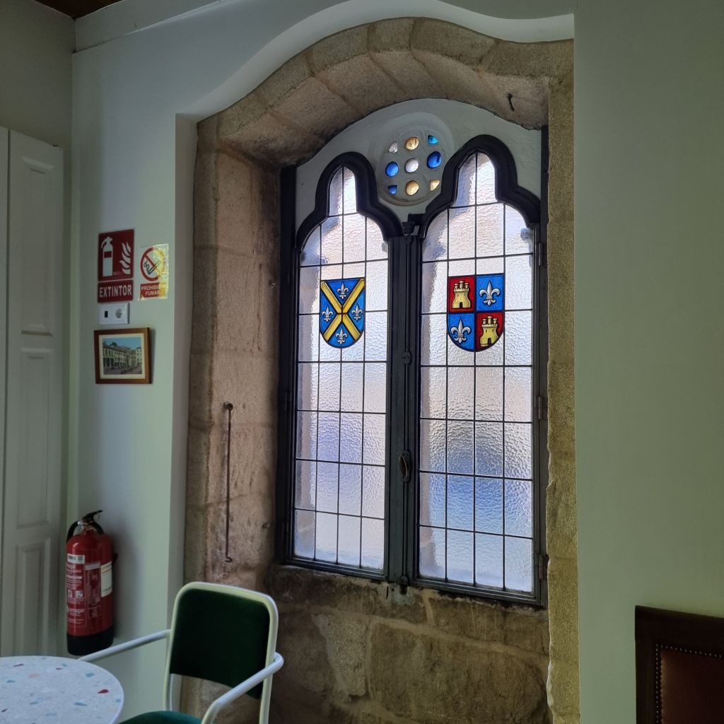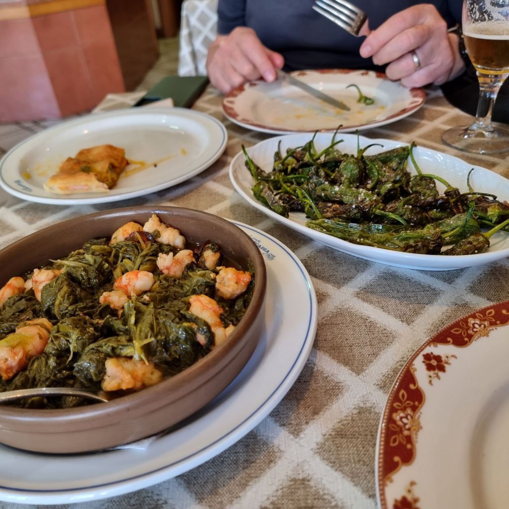 Hola. A bigger day on Wednesday with A Lot of steep climbing up amazing Roman roads and through the forest. Phew. But very beautiful. Pontevedra is a lovely town with a church dedicated to peregrinos, shaped like a scallop shell. They seem to frequently have chandeliers in churches here, even the tiny ones. Interesting. Sore feet but happy hearts.